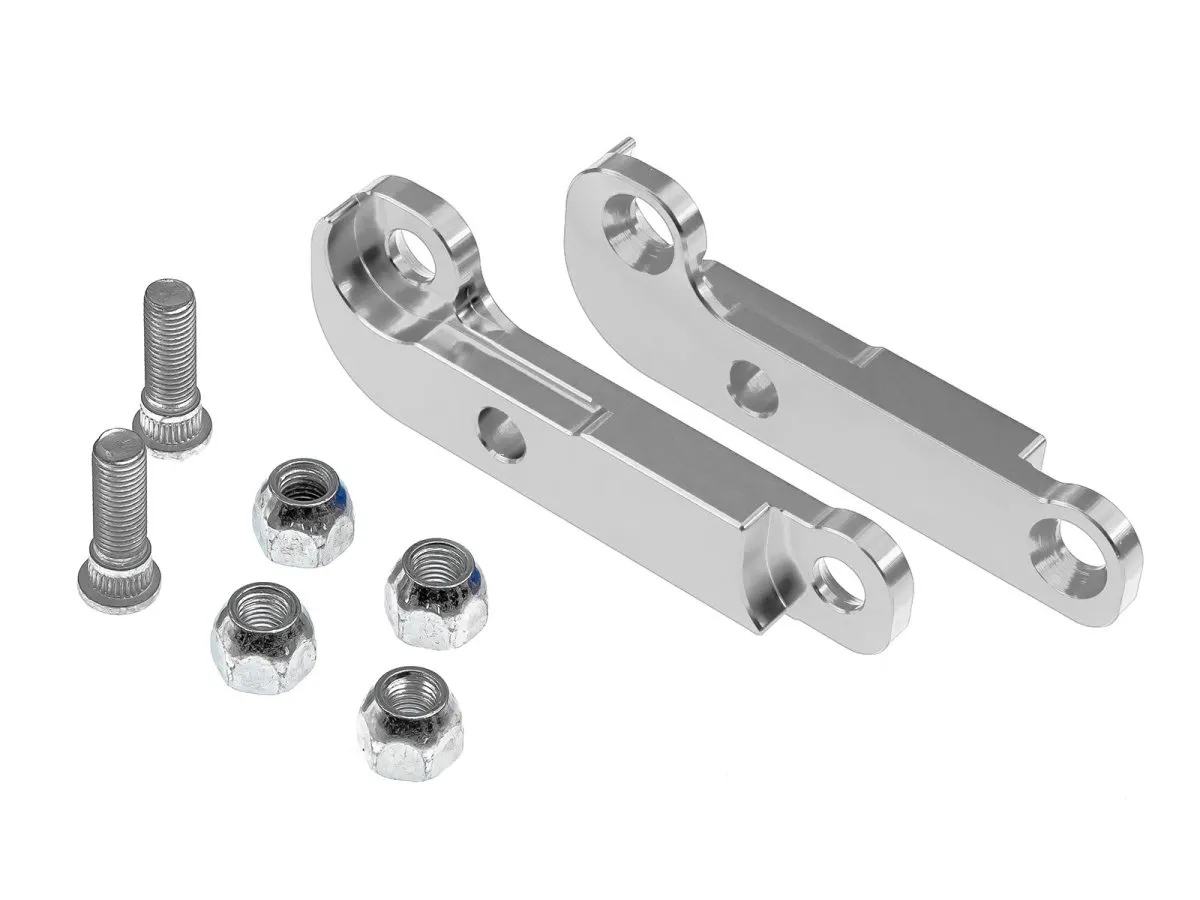 Adaptoarele sunt prelucrate cu precizie CNC, avand distantierul gaurilor calculat pentru a asigura un unghi mare de viraj. Setul include 2 adaptoare, suruburile si saibele necesare.